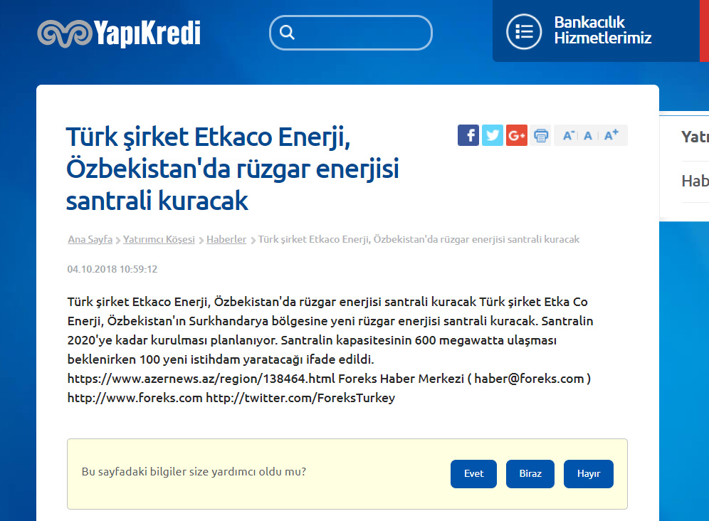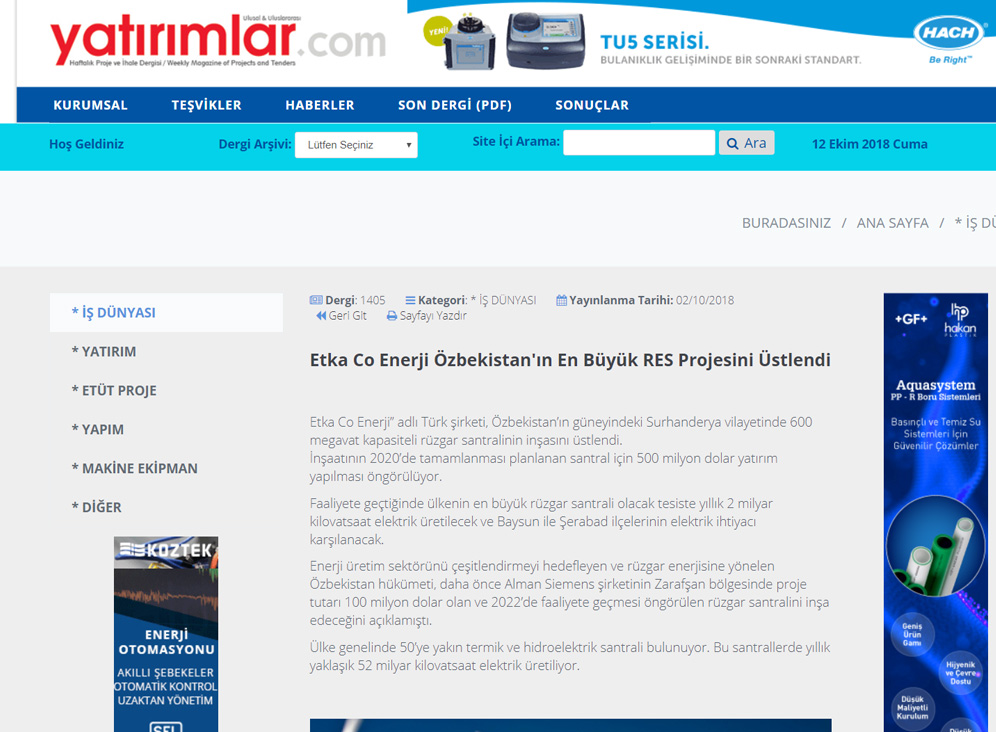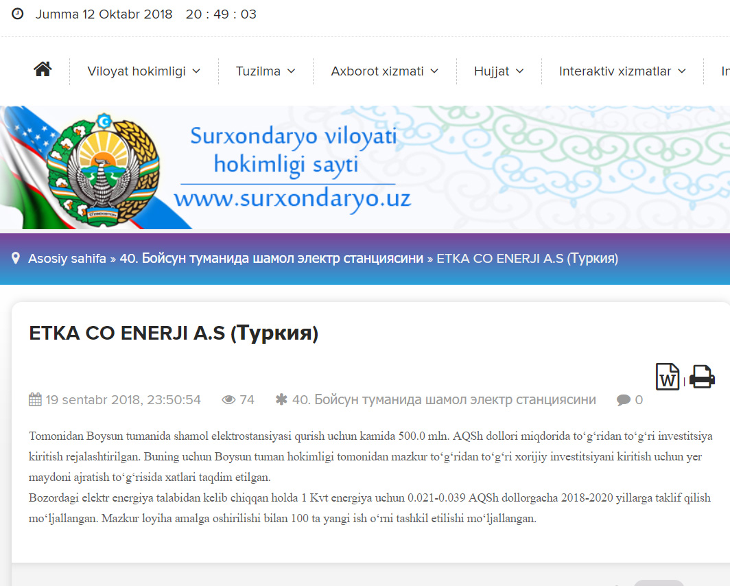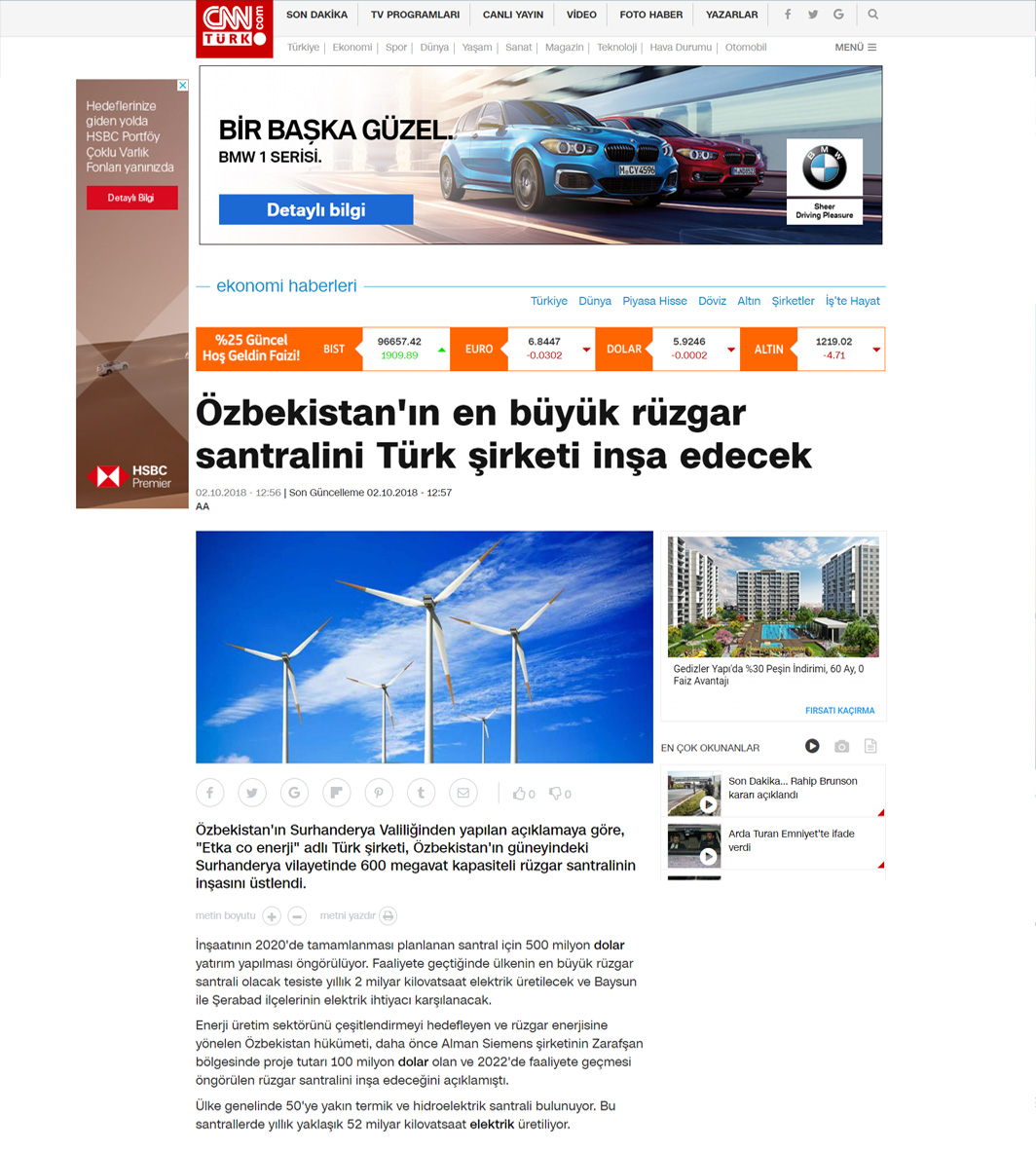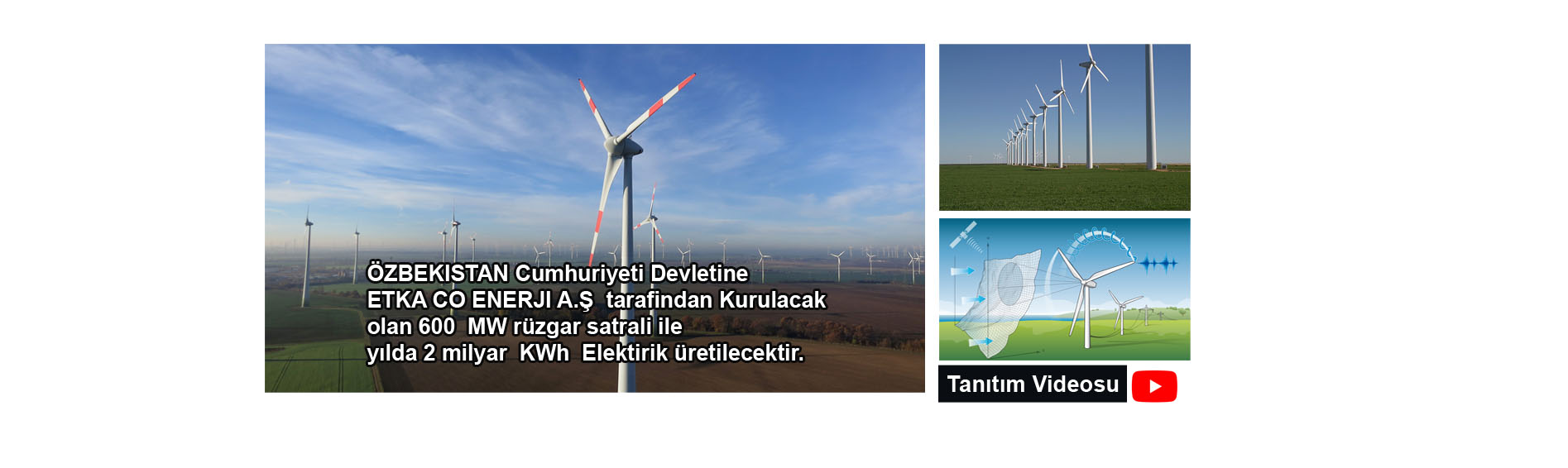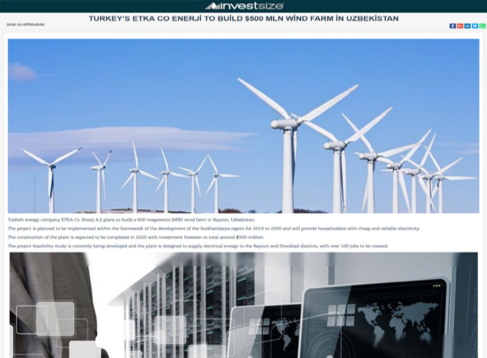 ÖZBEKİSTAN * ÖZBEKISTAN Cumhuriyeti Devletine ETKA CO ENERJI A.Ş tarafindan Kurulacak olan 600 MW rüzgar satrali ile yılda 2 milyar KWh Elektirik üretilecektir. *Bu da 800.00 kişinin 1 yıllık Enerji ihtiyacını karşılayacağız *110.000.000 Adet ağaç dikimine eş değet karbon azaltımını sağlıyacağız *ÖZBEKISTAN cumhuriyeti devletine yapilacak olan 600 MW lik Rüzgar santralinin yatirim bedeli 1.000.000.000 USD (bir milyar USD)üzerindedir Yine Özbekistan Cumhuriyeti Devletine farklı sektörlerde proje safasında olan, Rantabl ve Mükemmel 29 adet projenin hayata geçmesiyle ülke ekonomisine çok ciddi katkı sağlayacak olan bu proelerin yatırım tutarı da 1.660.000.000 EURO (bir milyar altı yüz atmış milyon euro ) dur.
